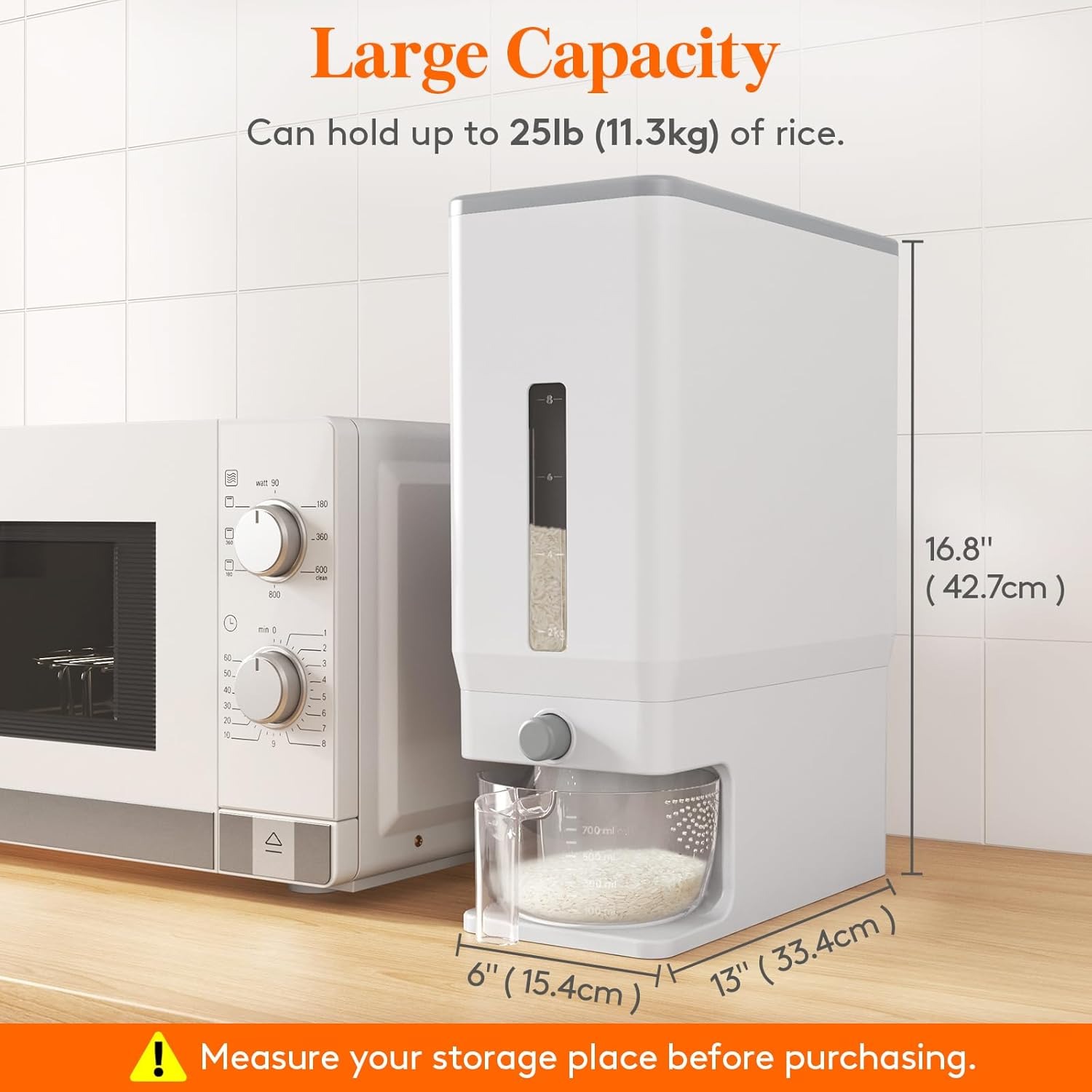 - Large Capacity: This rice storage container can hold 25.4lb (11.3kg) of rice, allowing you to store more rice for a long time and keep it hygienic. It can not only store rice, but also other small grains like soybeans, corn, sago, beans.