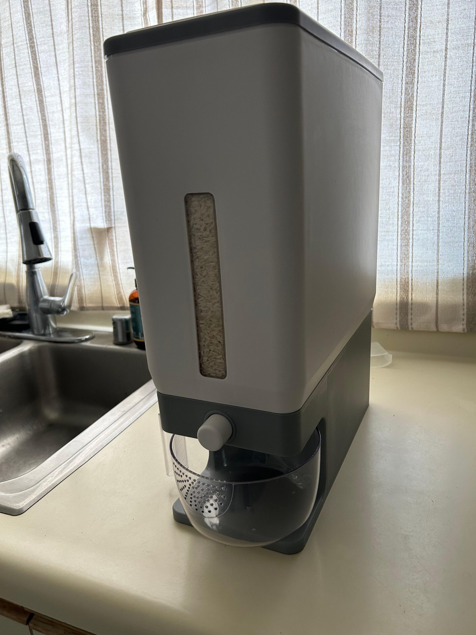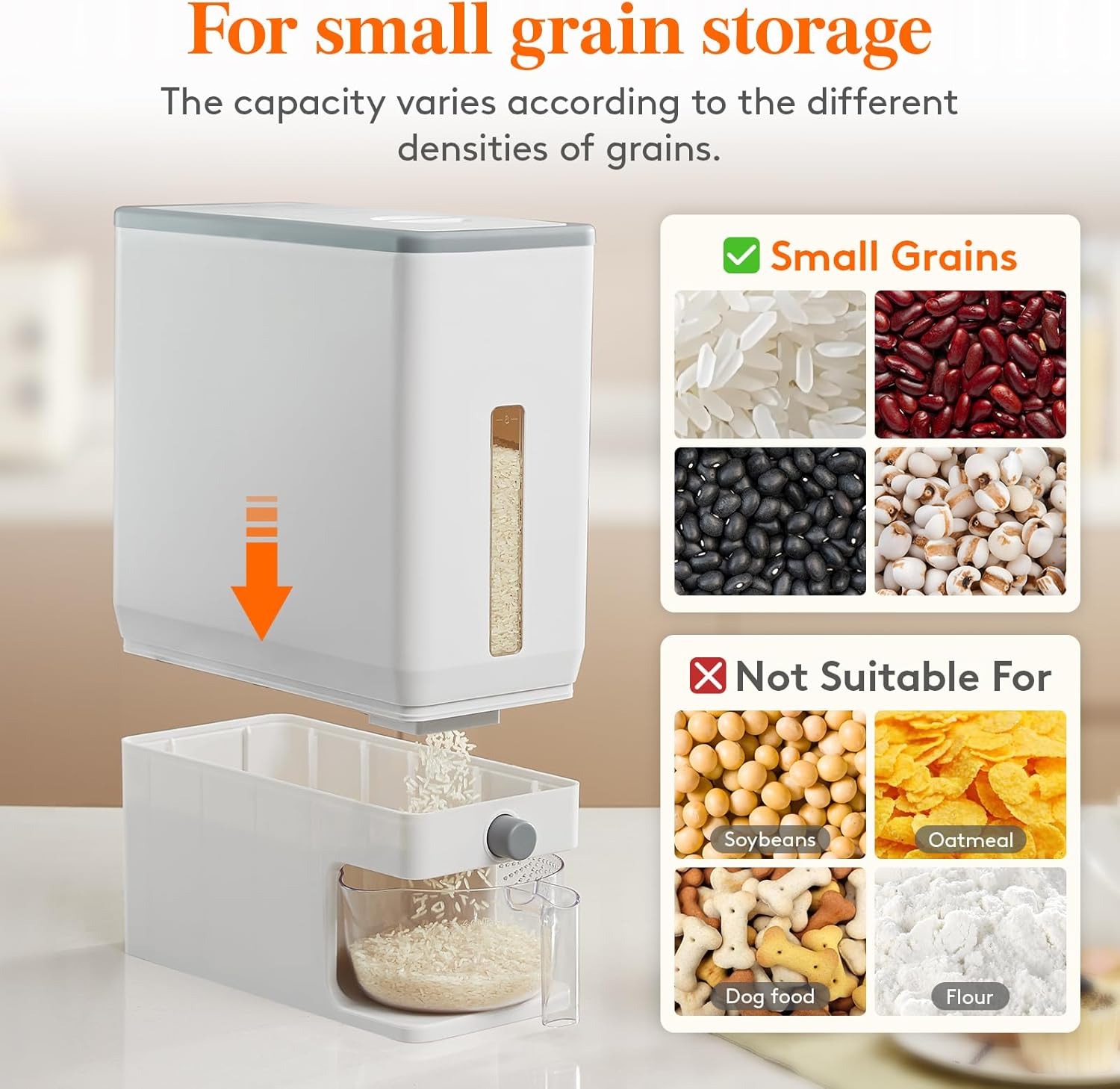- Excellent Airtightness: This grain dispenser is made of premium PP material, and is durable for long term use.The sealing ring inside the lid ensures excellent airtightness, keeps your rice as fresh as the day you stored it. It is also smell proof, so your grains can be safely stored.
