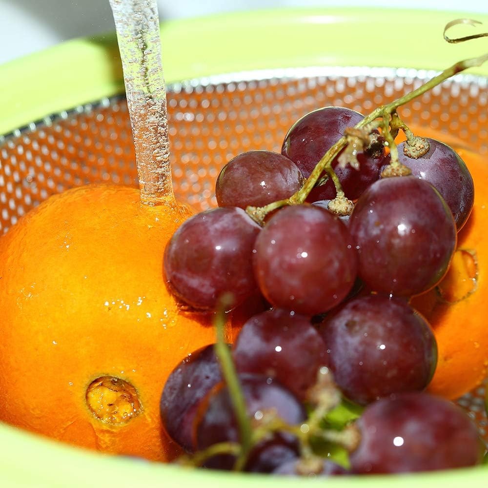 • ★ LARGE CAPACITY & VERSATILE: 5-quart capacity to hold and drain everything from pasta, spaghetti, noodles, berry, all kinds of veggies like spinach carrots broccoli, fruits, to salads. Its diameter is 10.5”, height is 4.1”.